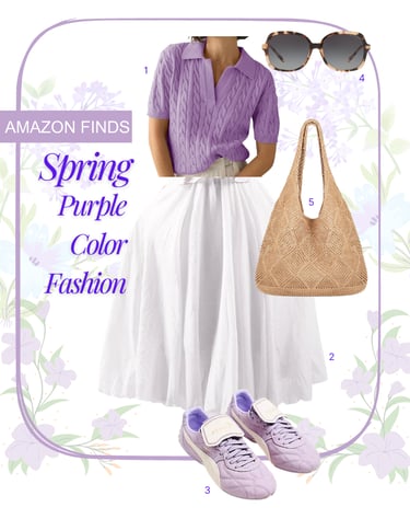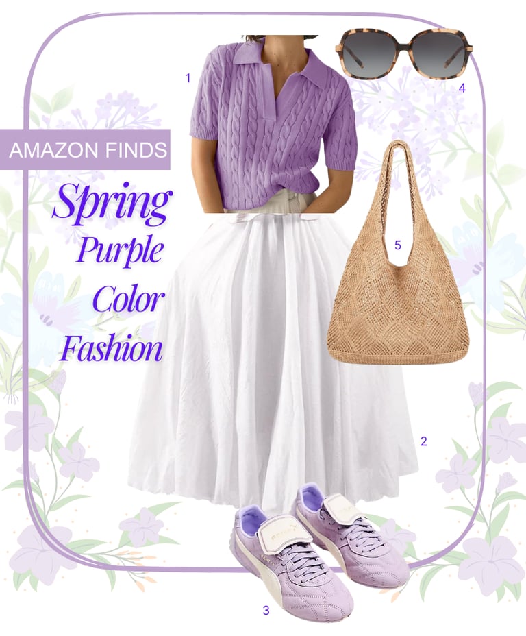 This moodboard captures a fresh, breezy Spring Purple Color Fashion aesthetic. It centers on a soft lavender palette paired with crisp white and organic textures, creating a look that is both playful and sophisticated. The ensemble features a lilac cable-knit polo sweater, a voluminous white midi skirt, and sporty purple sneakers, balanced by earthy accessories like a woven straw tote and classic tortoiseshell sunglasses.