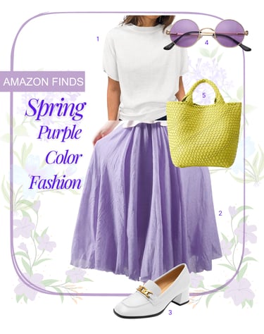 This moodboard presents a vibrant and sophisticated take on Spring Purple Color Fashion, emphasizing a playful contrast between lavender and citrus tones. The outfit features a crisp white short-sleeved knit top paired with a flowing, floor-length lavender maxi skirt that serves as the focal point.